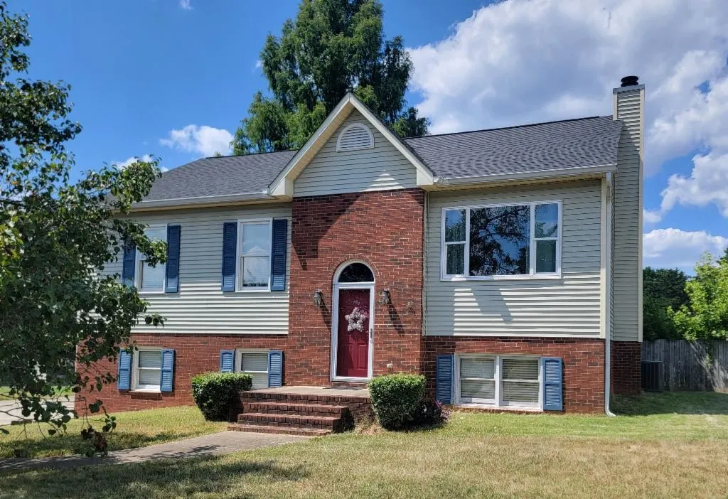 The home features a stylish split-level design with a classic brick and vinyl exterior,